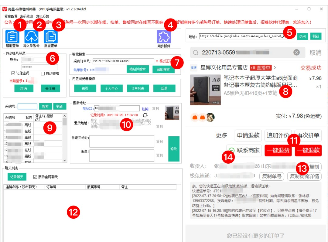 南星多多售后 1.智能查单:解决采购号太多,一键智能查询售后单,无需手工切换采购号 2.导入采购号:可以通过其他第三方软件导出拼多多状态,导入本软件! 3.批量查单:可批量导入订单号,批量查询订单的状态,方便快速核查订单状态 4.同步插件:采购号同步插件,可实现浏览器和软件,跨电脑实时同步在线 5.访问地址URL:正在访问的网页URL地址,可输入链接访问或刷新页面 6.同步账号登录:用于同步采购号使用,可在软件或浏览器插件进行注册 7.智能搜索:输入采购订单号智能查单,无需手工切换采购号,软件自动查询结果并展示出来 8.订单信息:此处显示我们需要处理售后的订单基本信息 9.采购账号列表:拼多多采购号账号列表,可右击备注信息,可点击刷新获取最新列表和状态 10.售后地址:可AI智能显示80%以上的总店退货地址 11.订单操作:一键咨询总店商家,一键退货,一键退款 12.聊天列表:可记录总店聊天窗口,方便下次双击继续聊天,可记录售后页面,方便双击打开便捷处理,可右击备注 13.一键复制:一键复制收货人信息,快递运输记录,方便与自己客户快捷回复沟通 14.联系商家:捷联系商家,单聊天文字一键复制,可下载视频和图片,可给总店发送视频,方便处理售后