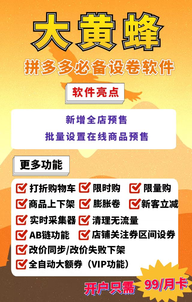 大黄蜂上货助手 1.支持拼传拼,直接采拼多多商品到自己店,省去中转步骤 2.自带营销工具,如立减券、限时购,拉流量促转化 3.免费实时采集拼多多数据,提供准确信息,辅助定价选品 4.持续更新功能,如自动大额券、新客立减、满减活动,提升营销效果 5.操作界面简单,带视频教程,新手快速上手