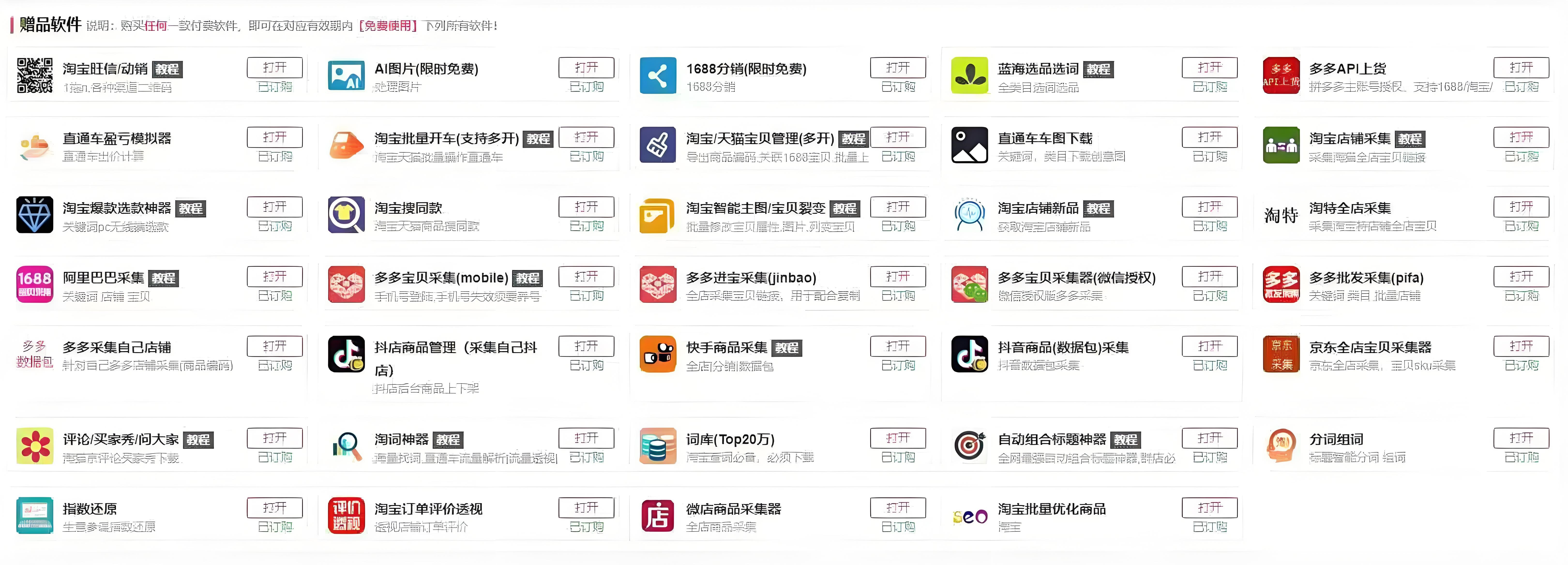 3.提供40多种辅助工具:蓝海选词、订单透视、数据包采集、竞品分析等,开通即送全套