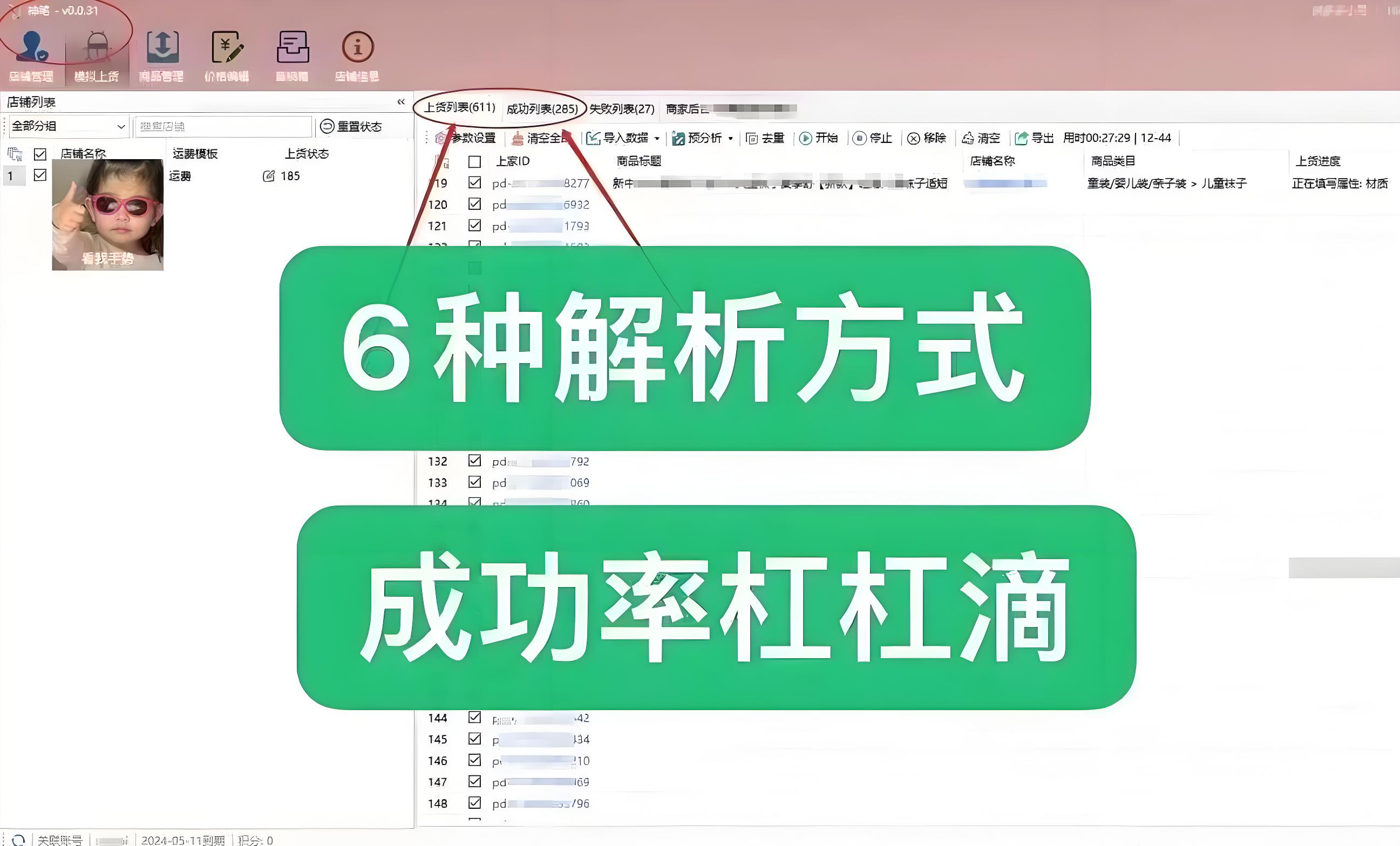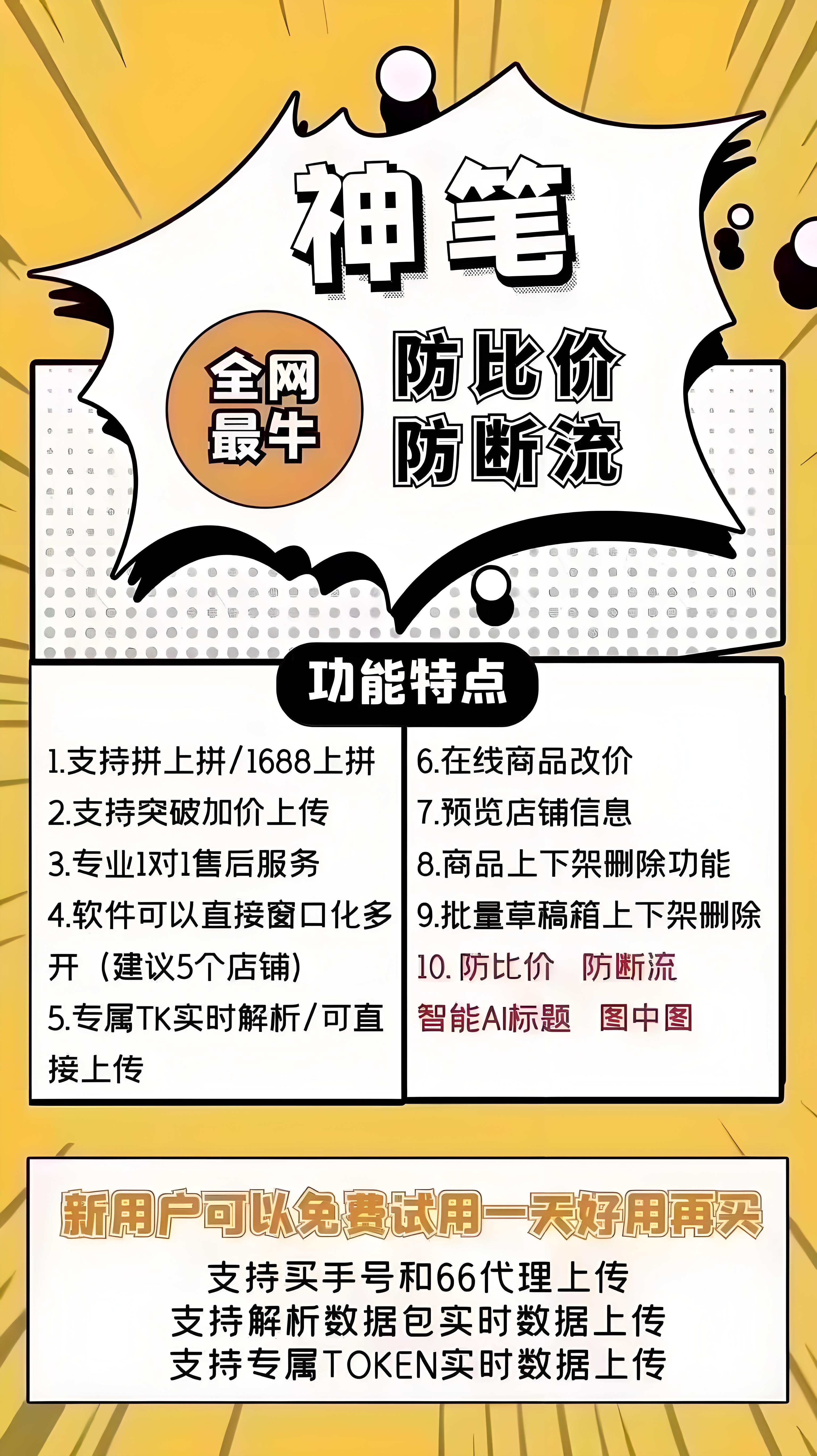 神笔上货 1.支持拼上拼、1688上拼,实时解析多平台商品 2.可窗口多开,建议同时操作5个店铺,高效省时 3.智能AI防比价,避免被比价,防断流更稳定 4.兼容多种上货方式:买手号、微信小程序、66实时、私密代理、数据包、TK解析