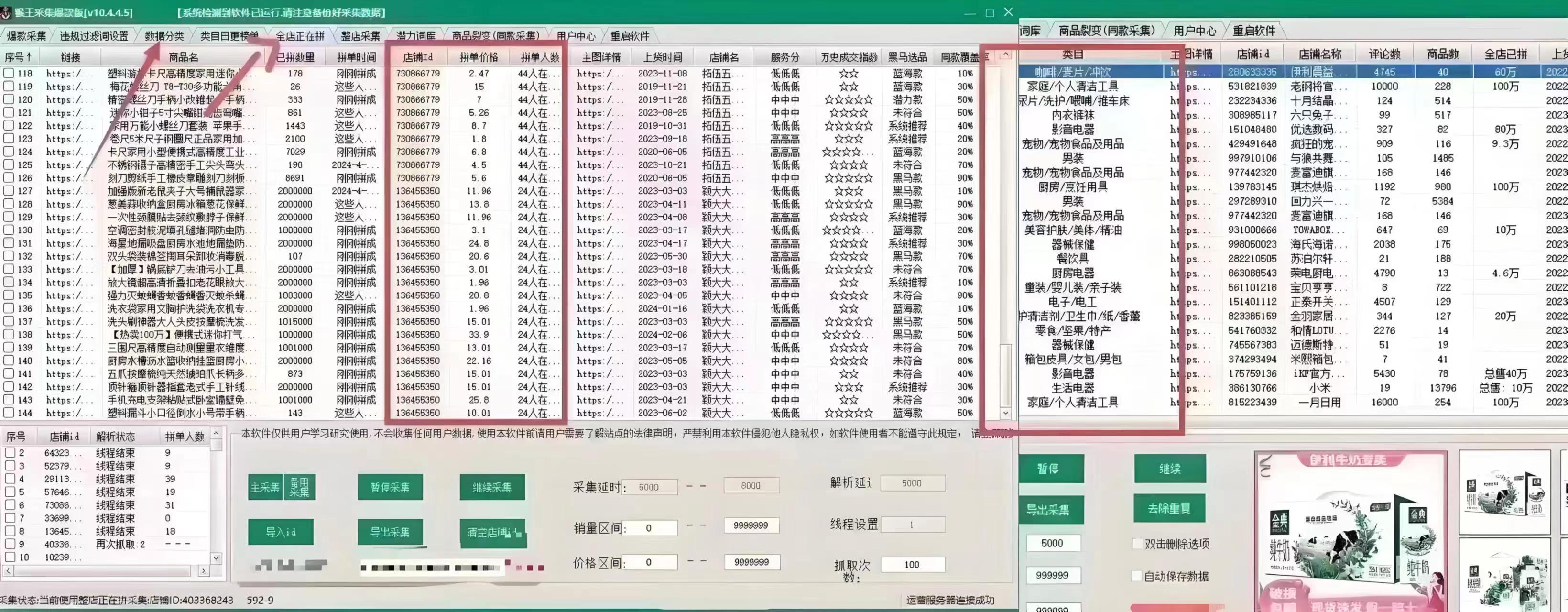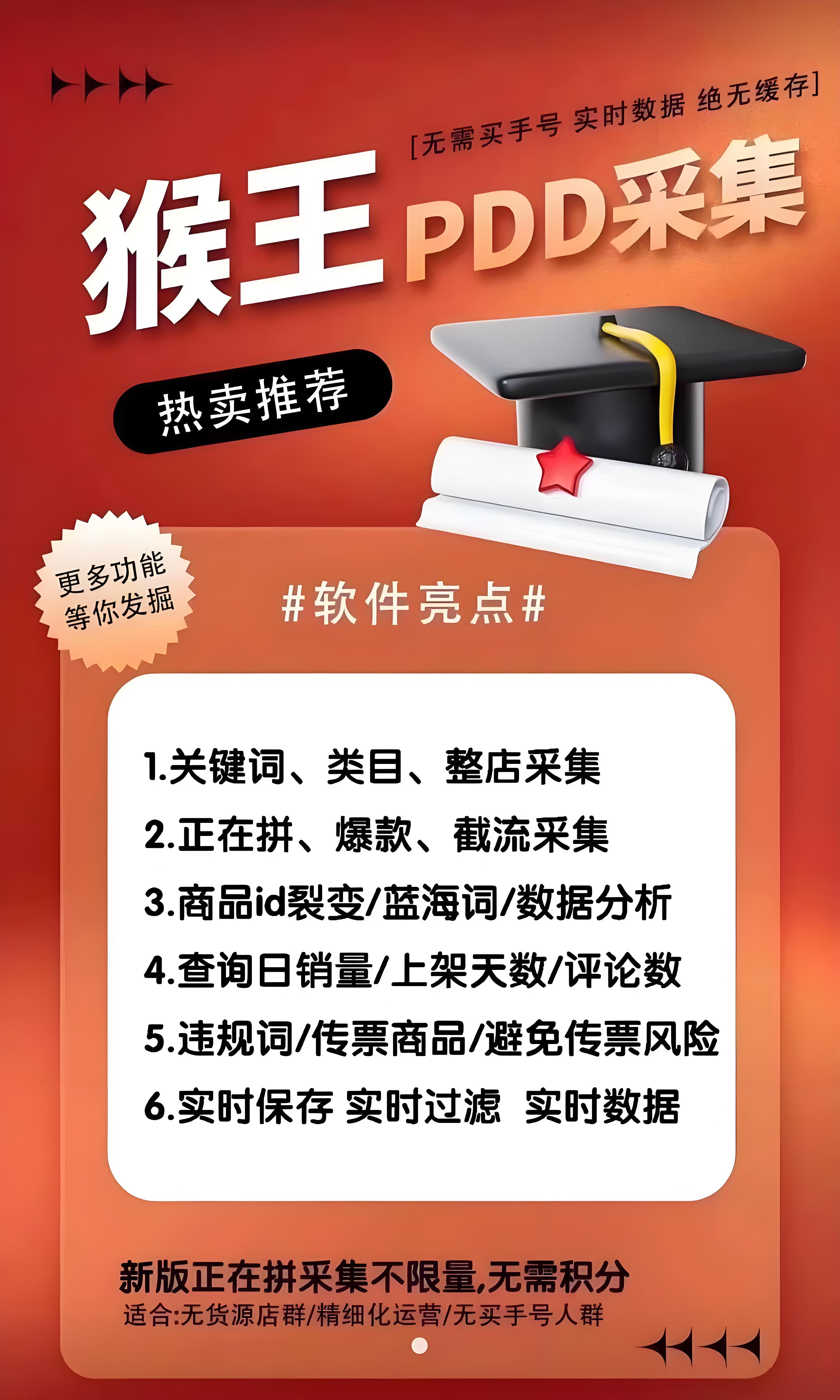 猴王采集 1.实时采集拼多多商品数据 2.可以按类目截流采集商品 3.支持整店采集和查看店铺实时销量 4.显示每日销量和上架时间 5.提供蓝海选品功能 6.自动过滤重复商品 7.自带数据分析和商品图鉴 8.无需买手号 9.自动处理关键词 10.支持多种采集模式混合使用