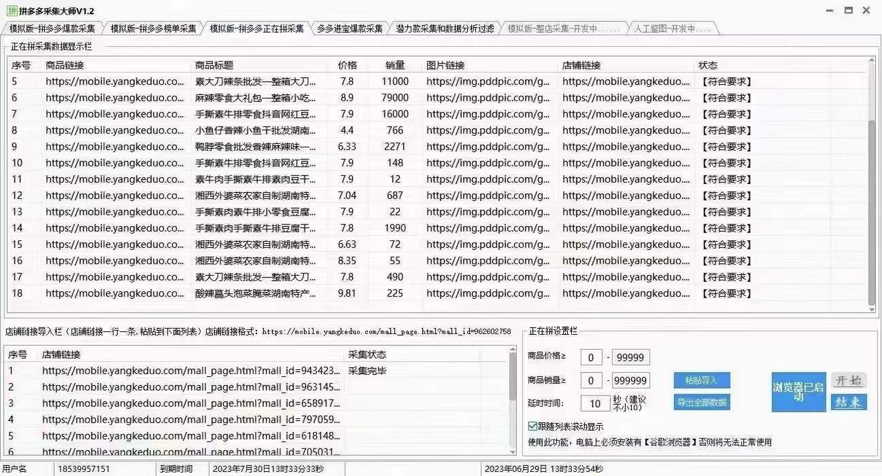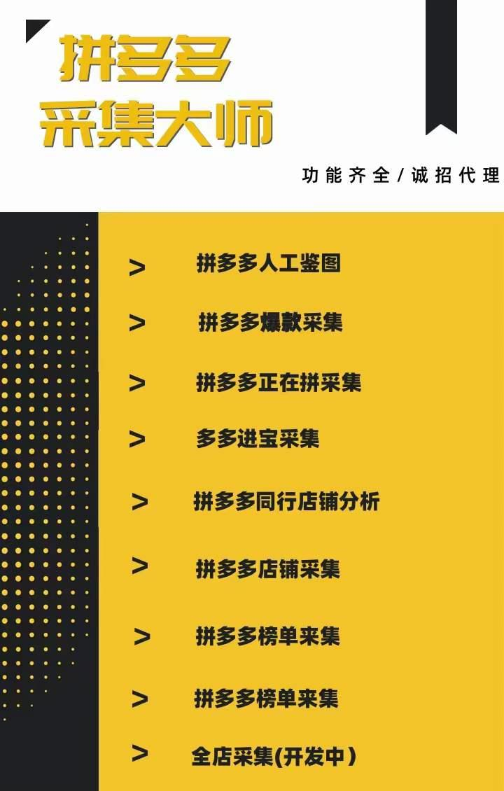拼多多采集大师 1.免买手号和微信号,安装注册就能用,自带TOKEN方便安全 2.支持关键词爆款采集,自动整理分类,查市场热销品 3.带多多人工鉴图功能,准确识别商品图片,保真防骗 4.可采集店铺商品、正在拼优惠活动,实时调整销售策略 5.同行店铺校验,快速比货比价,找优质供应商 6.API采集不黑号,避免平台限制,用着放心