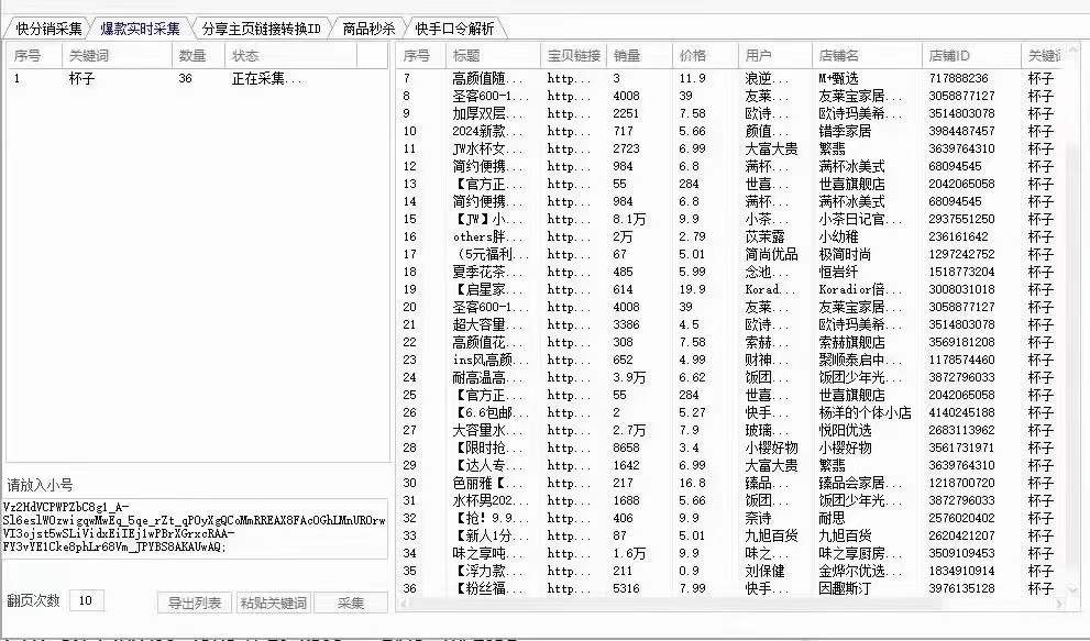 1.支持快手爆款采集,输入关键词即可获取商品价格、30天销量、佣金、同行上架次数等数据