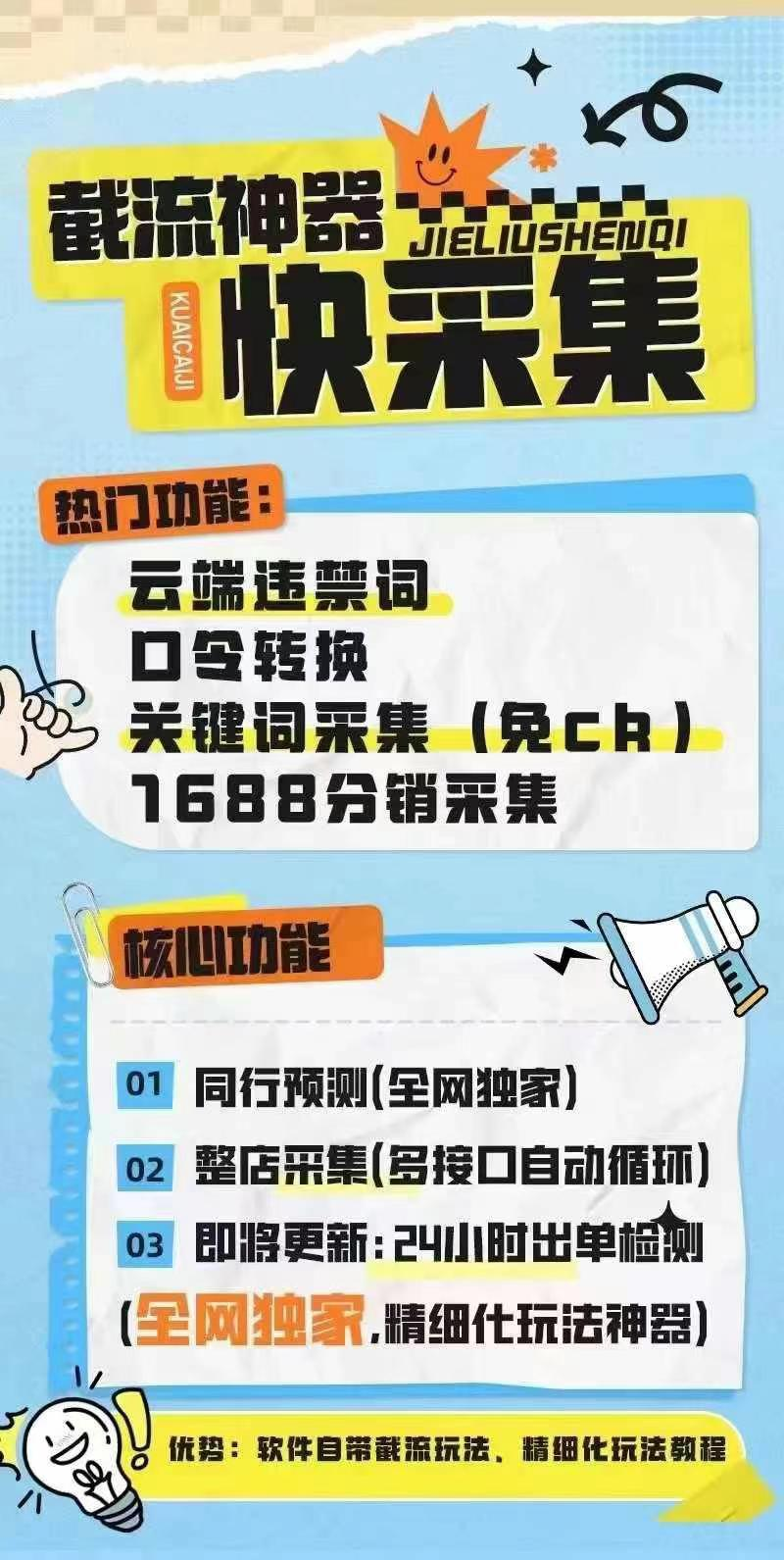 快采采集 1.支持快手爆款采集,输入关键词即可获取商品价格、30天销量、佣金、同行上架次数等数据 2.一键整店采集同行店铺商品,分析销量、价格区间,方便对比数据 3.主页分享链接转店铺ID,减少人工操作,快速定位同行店铺 4.提供全面的数据分析,帮助卖家快速找到热卖商品,优化选品策略 5.适合快手店群运营,高效截流,节省时间和工作量