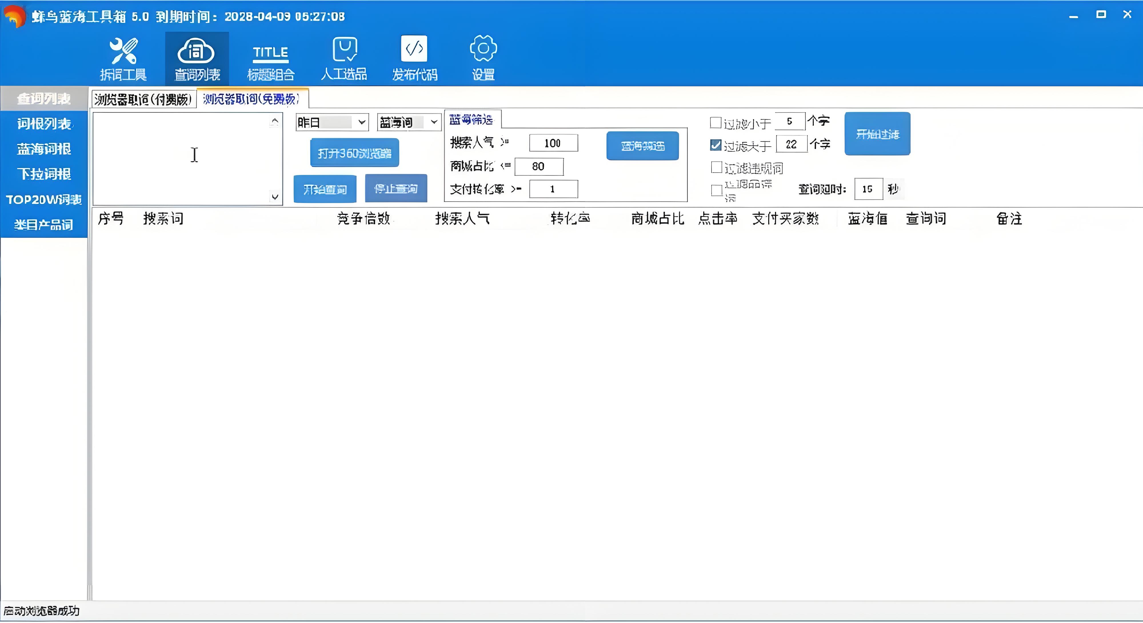 蜂鸟蓝海工具箱 1.支持三种查词接口,谷歌和360浏览器用旧版生意参谋登入,可查全类目昨天/7天/30天数据 2.词根查询导入xlsx表,看搜索人气、搜索词数、转化率等详细指标 3.可获取下拉词和词根,自带TOP20W词表 4.标题组合功能,支持裂变、精细化组合和蓝海前置 5.带人工选品和发布代码,可自定义标题快速组合上传