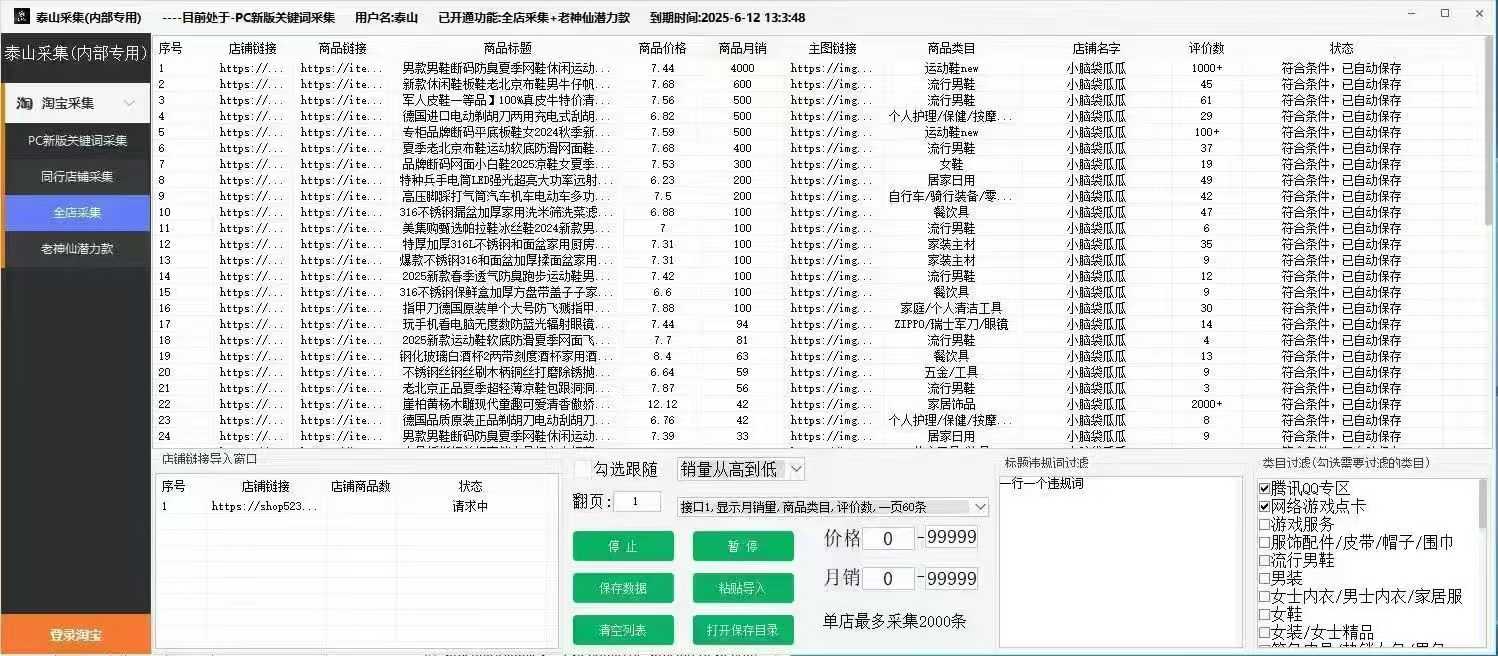 泰山采集 一款稳定的全店采集工具,支持销量排序,显示月销和月收人数,速度快,纯实时数据,无滑块,不死号