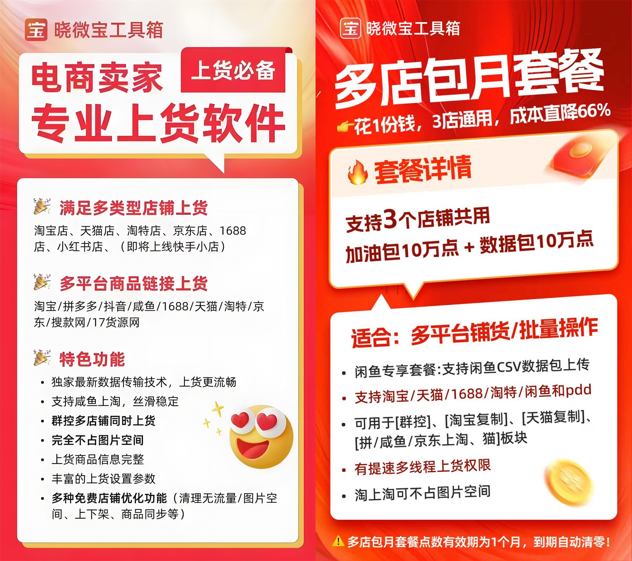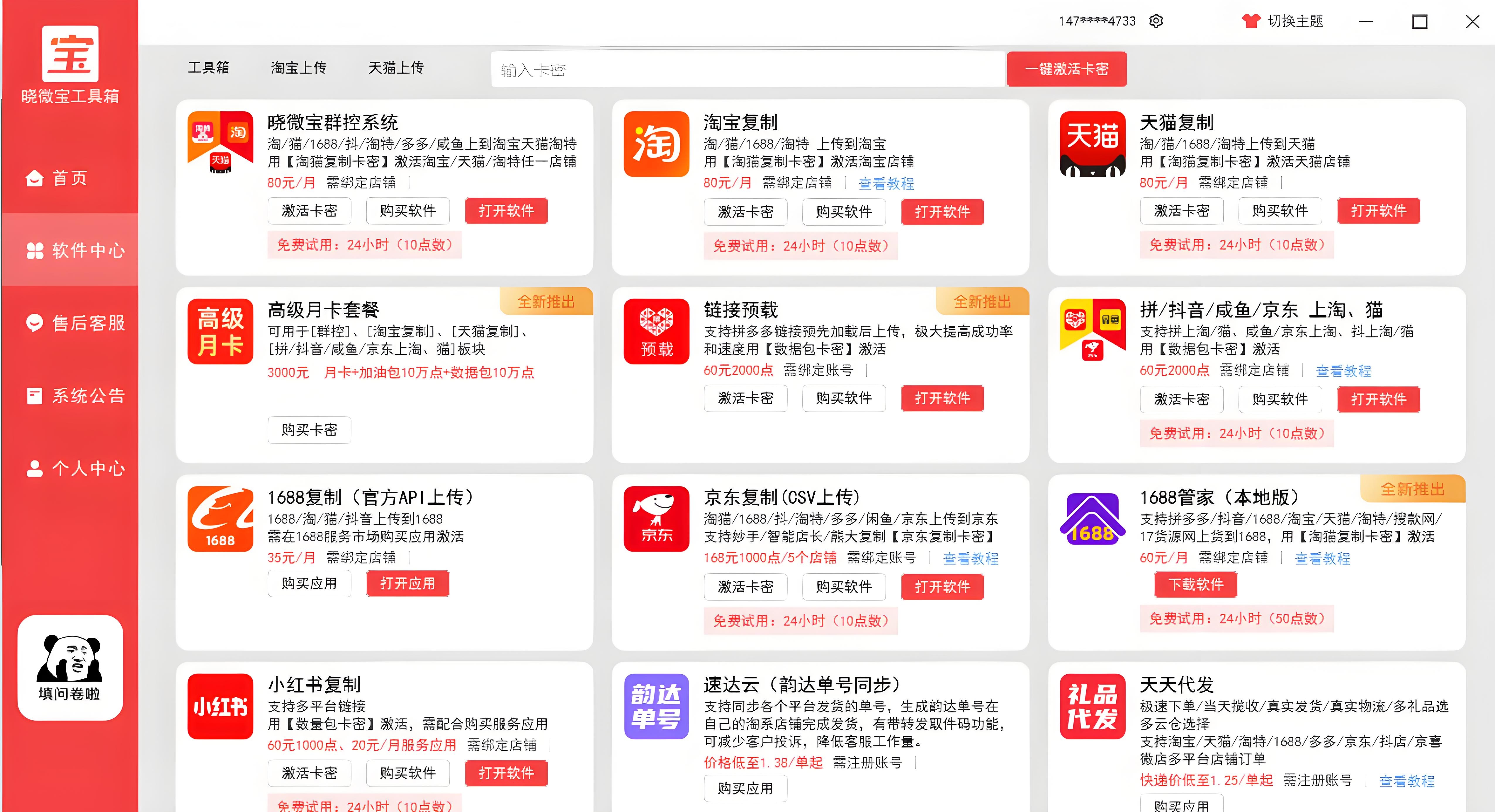 晓微宝工具箱 1.淘猫复制(月卡)用于开通淘宝复制,天猫复制,晓微宝群控系统,1688管家(本地版)软件激活 2.加油包(2000点)用于群控系统,淘宝复制,天猫复制,拼多多上淘/上猫。提速,突破日上1000条,不占图片空间 3.数据包(2000点)用于激活拼多多/抖音/闲鱼/京东上淘宝/天猫板块和群控系统版块上拼多多/闲鱼/抖音链接扣点(上传拼多多/闲鱼/抖音/京东链接到淘宝/天猫/淘特店铺需数据包点数) 4.京东复制(1000点)用于开通京东复制(共上传1000条,最多绑3个店铺,有效期一年) 5.数量包(1000点)用于小红书店铺复制和1688管家增加点数,绑定主账号