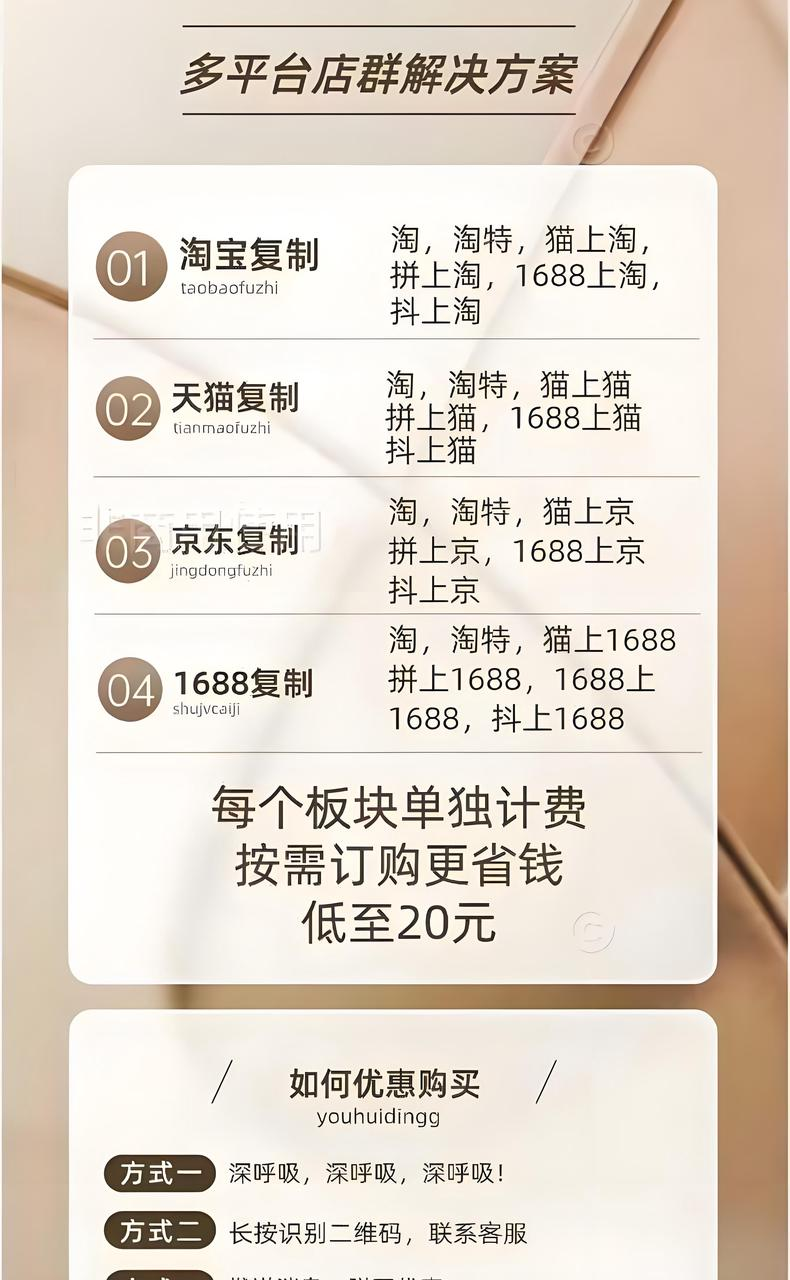 群英会 1.支持淘上淘、拼上淘、抖音上淘、1688上淘、天猫上淘、京上淘等8种上传方式,无需授权 2.可上传成人、食品、图书等特殊类目,支持突破500等限制 3.免费提供多种功能:1688打标、无痕二维码、淘词、清理无流量、批量上下架和删除、同步宝贝、清理运费模板等 4.月卡含复制额度,用完可续费额度包,时间和点数可叠加,到期清零 5.拼上淘可通过自带插件解析或其他工具制作数据包上传 6.软件支持多开,一台电脑可同时发布5-10个店铺,实现类群控效果 7.带裂变上货功能,节省图片空间,降低运营成本 8.提供违规处理、体检中心等一站式店铺管理支持