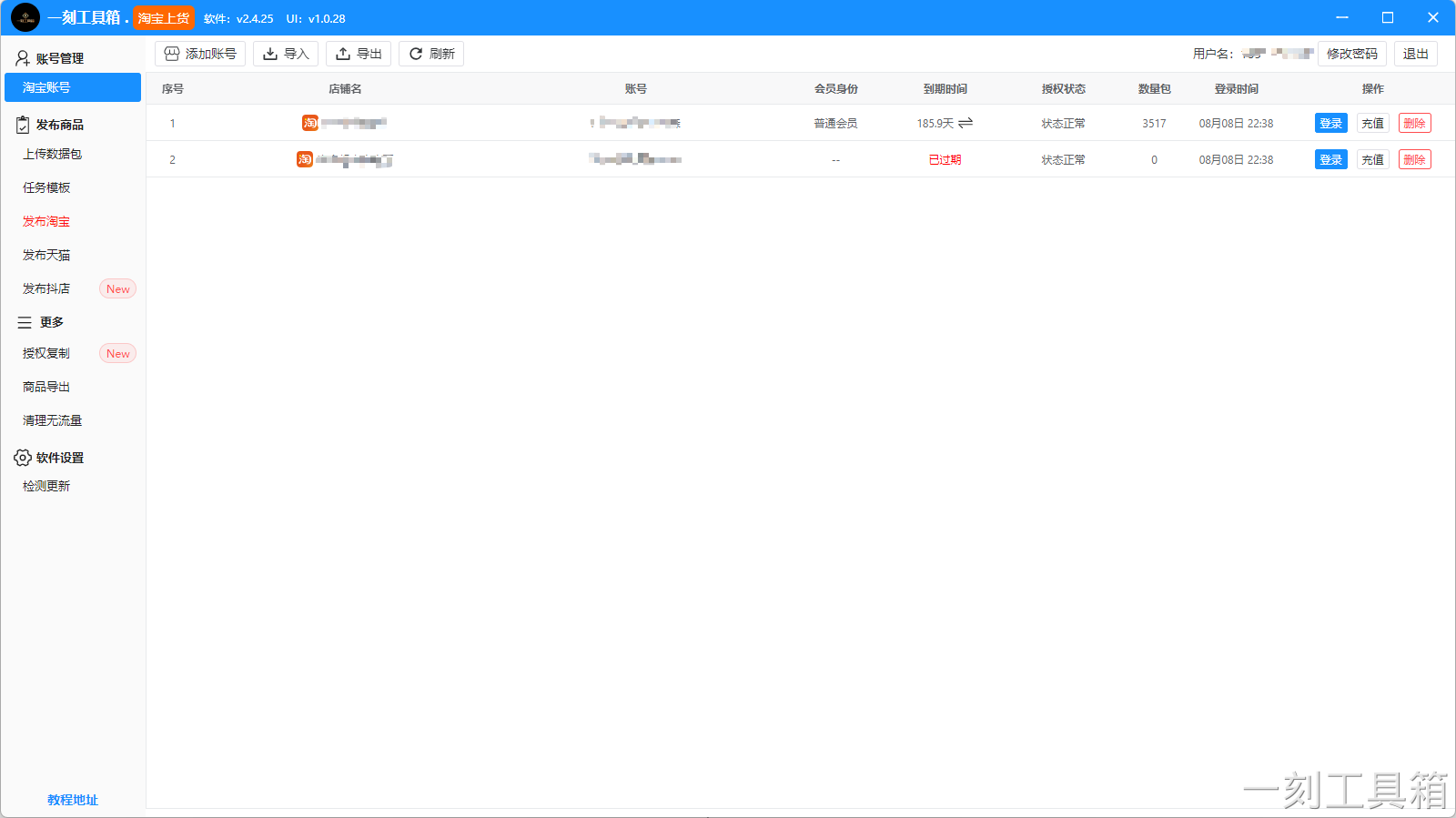 一刻工具箱 1.支持淘宝、天猫、1688链接上传到淘宝,用API接口上传,不出爬虫 2.分网页群控版和单机版:网页版浏览器直接使用;单机版需安装,可多开 3.可添加淘宝子账号,导入商品链接,自定义标题和价格 4.任务模板功能,常用设置一键套用,省去重复配置 5.支持图片视频处理:主图、详情、水印、压缩都能批量设置 6.多店铺多任务群控发布,可随时开始、暂停、修改任务