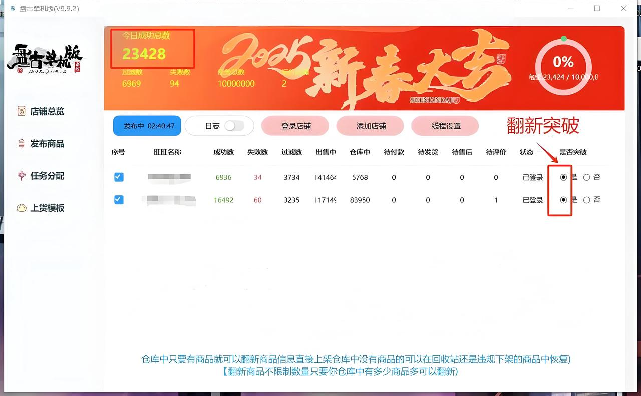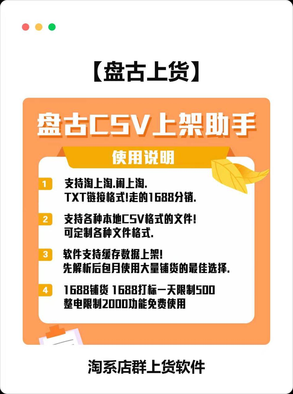 盘古上货助手 1.不限制上货数量,大量铺货不怕被限流 2.支持淘宝、天猫、1688、闲鱼链接一键导入上传 3.1688上淘需月卡,一天可上500条 4.淘上淘、闲鱼上淘需API+加油包,100元一万条 5.闲鱼和淘上淘需用csv格式,可用极限蓝海、极淘等工具转格式 6.多平台搬货,省时省事,适合快速开店铺货