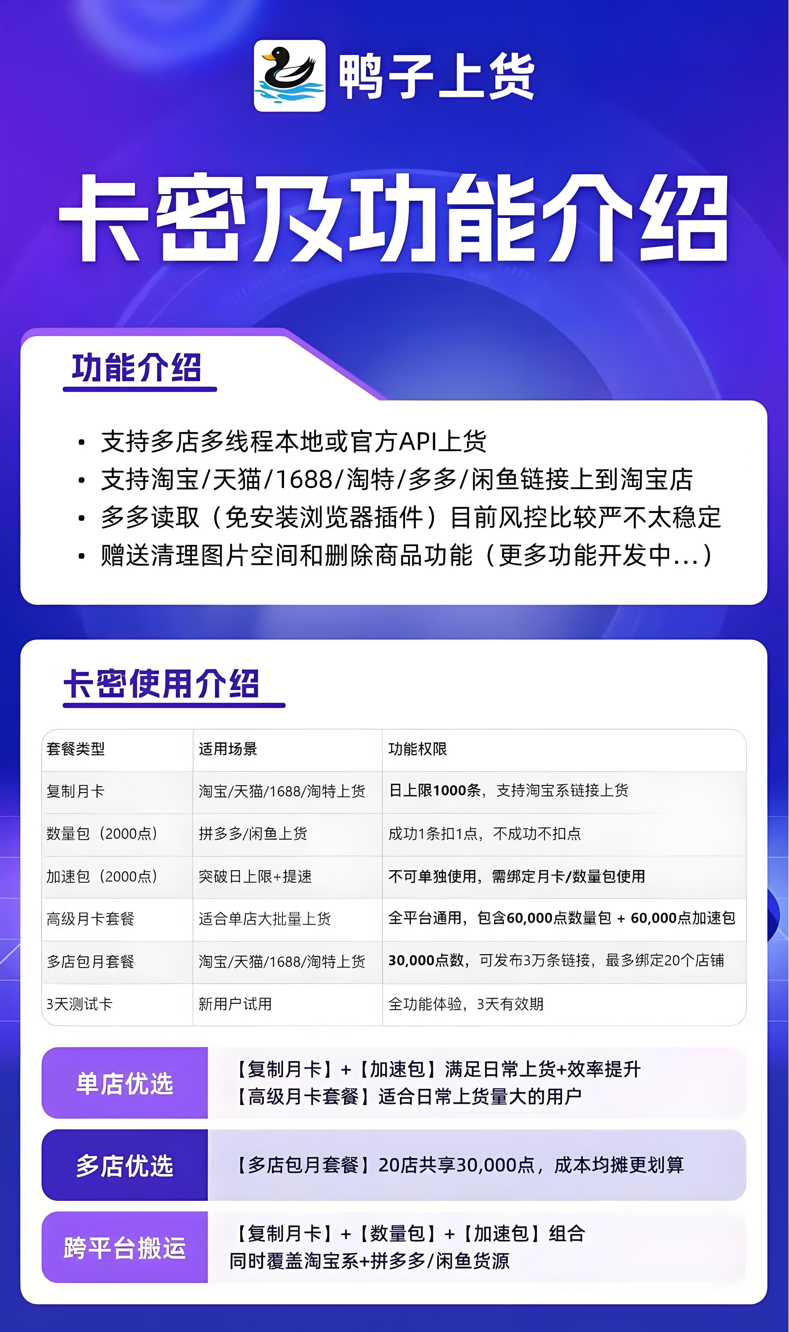 鸭子上货购买api接口可以突破1000+的上货限制,最新API订购链接: