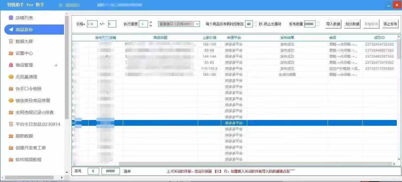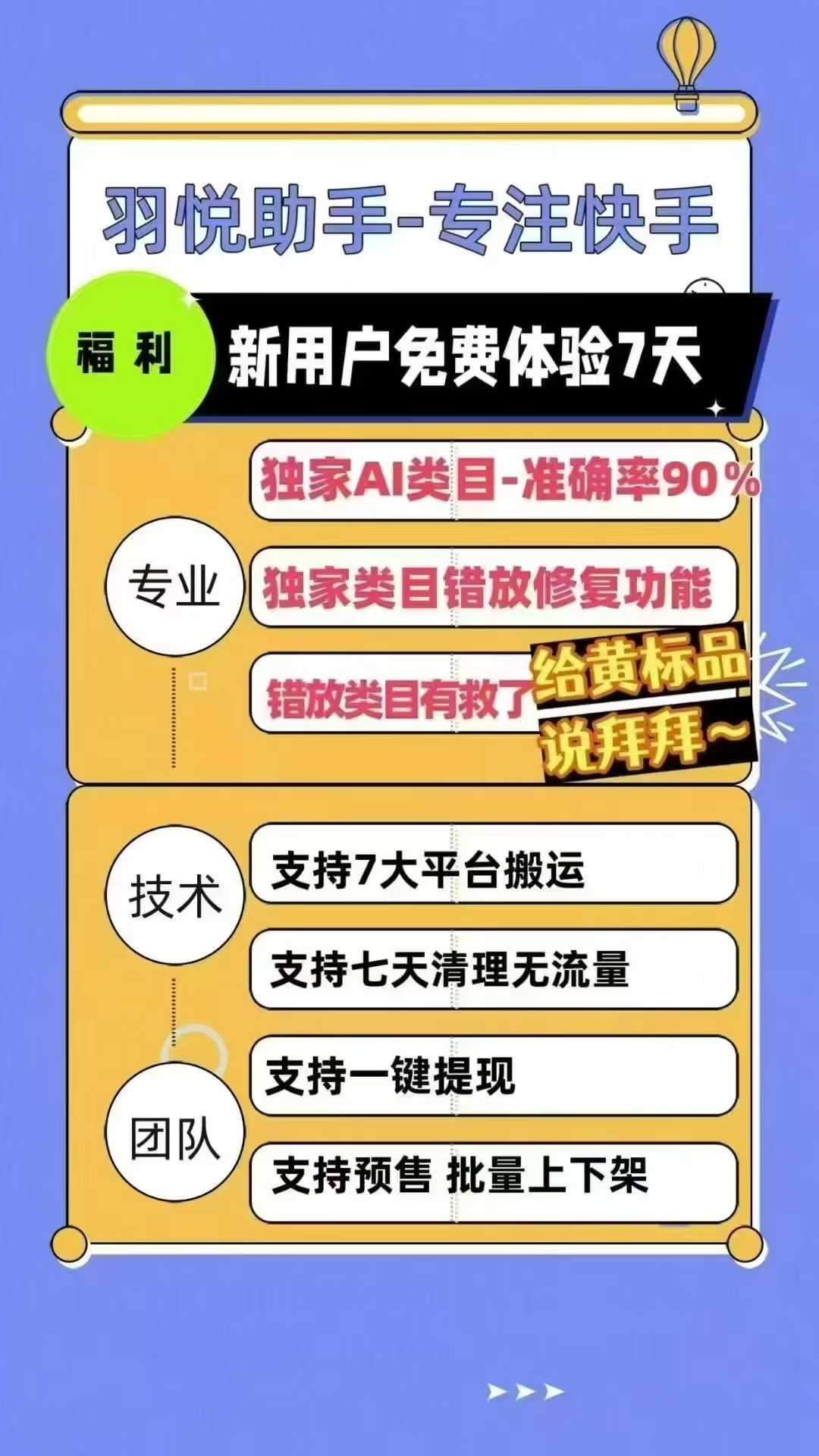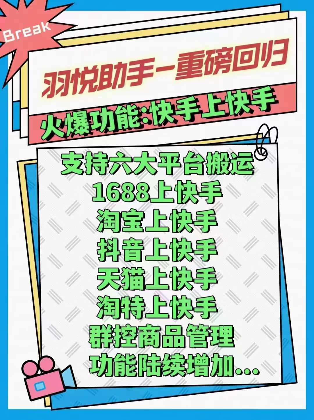 羽悦助手 1.支持淘宝、1688、拼多多、快手及抖音佣金链接上传至快手店铺 2.API接口操作,十几分钟可上满500个商品 3.独家AI自动匹配类目,准确率高,支持错放类目修复 4.7天免费体验,支持一键清理无流量商品和一键提现 5.可批量上下架和设预售,方便库存和活动管理