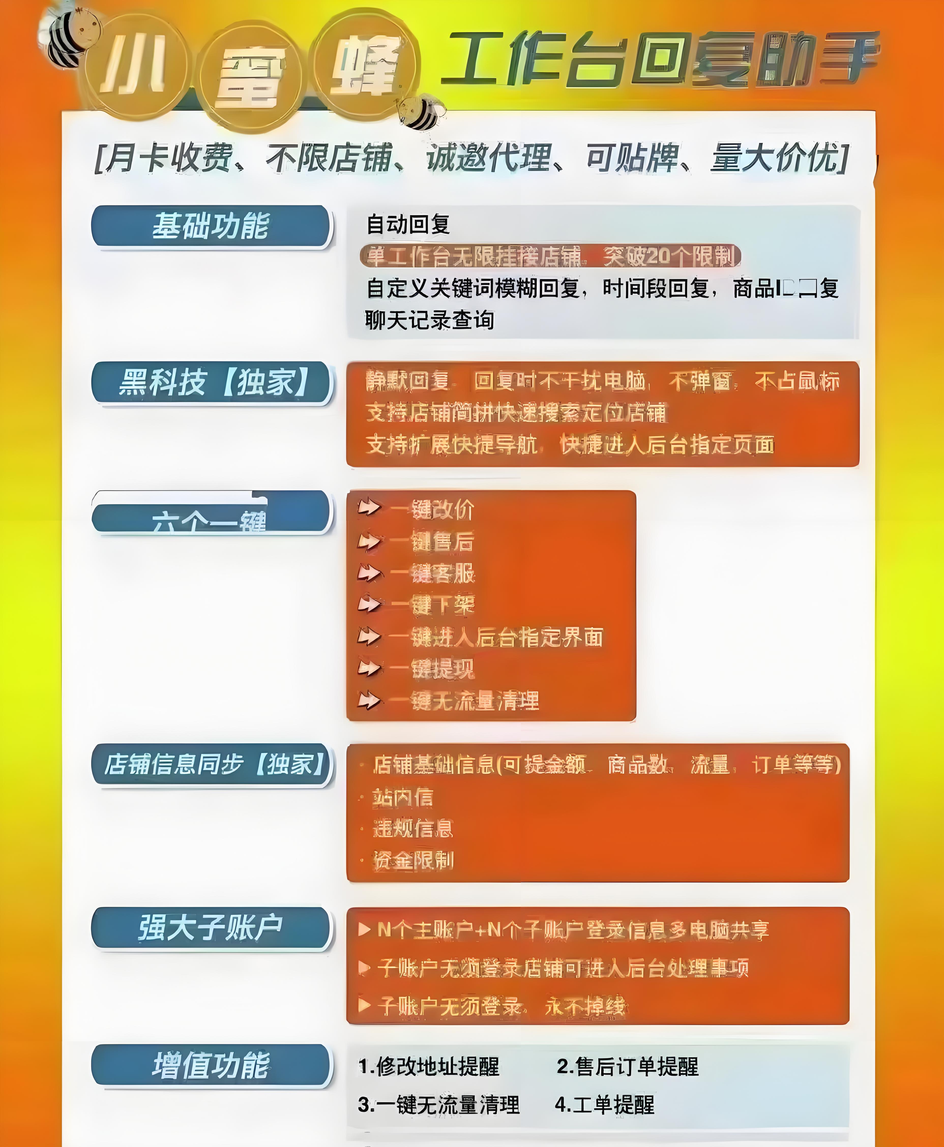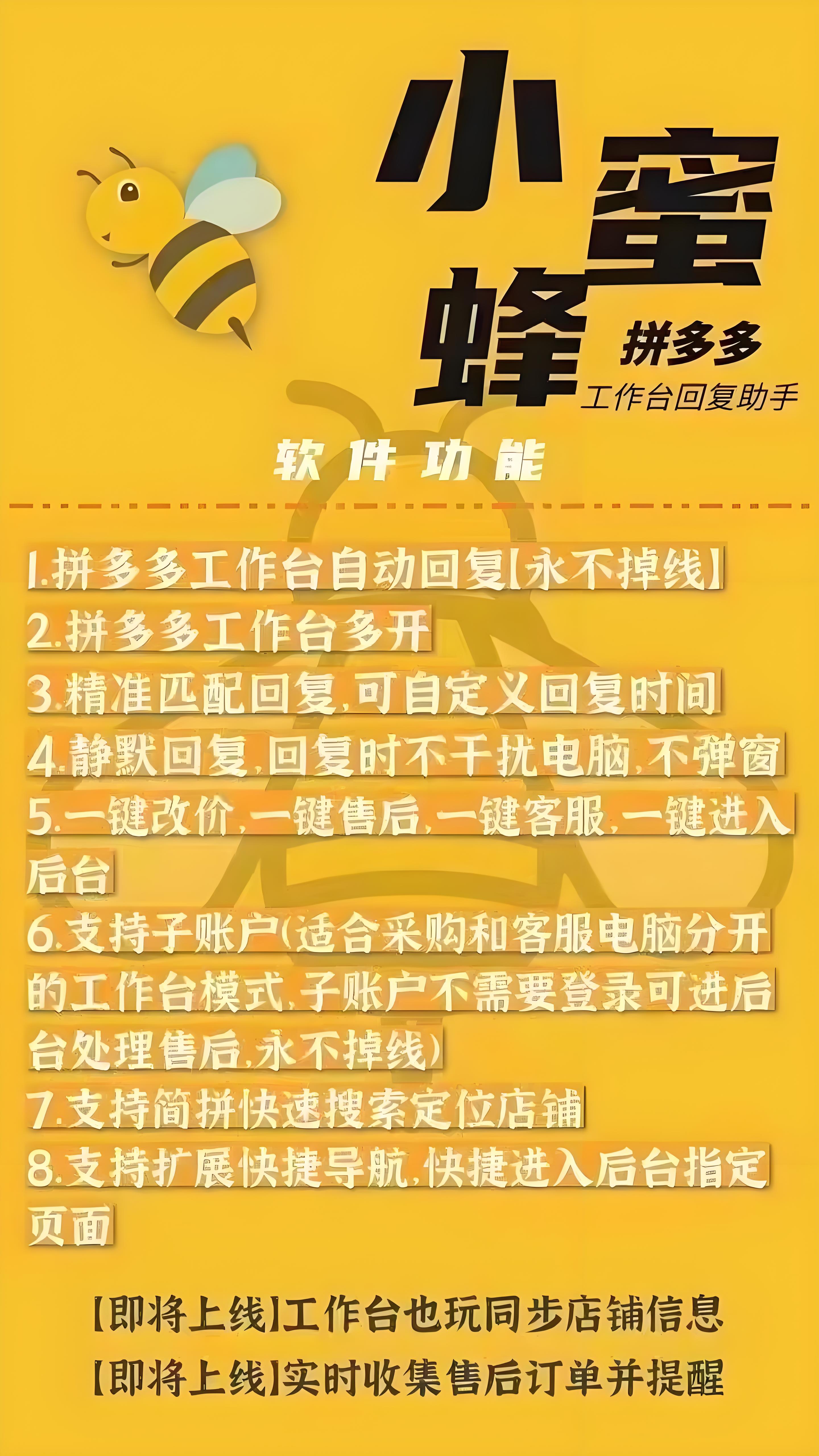 拼多多客服自动回复就用小蜜蜂,小蜜蜂工作台助手重磅更新,更新快速一键改价,增加同步违规信息,站内信,售后工单,三分钟回复率无忧。